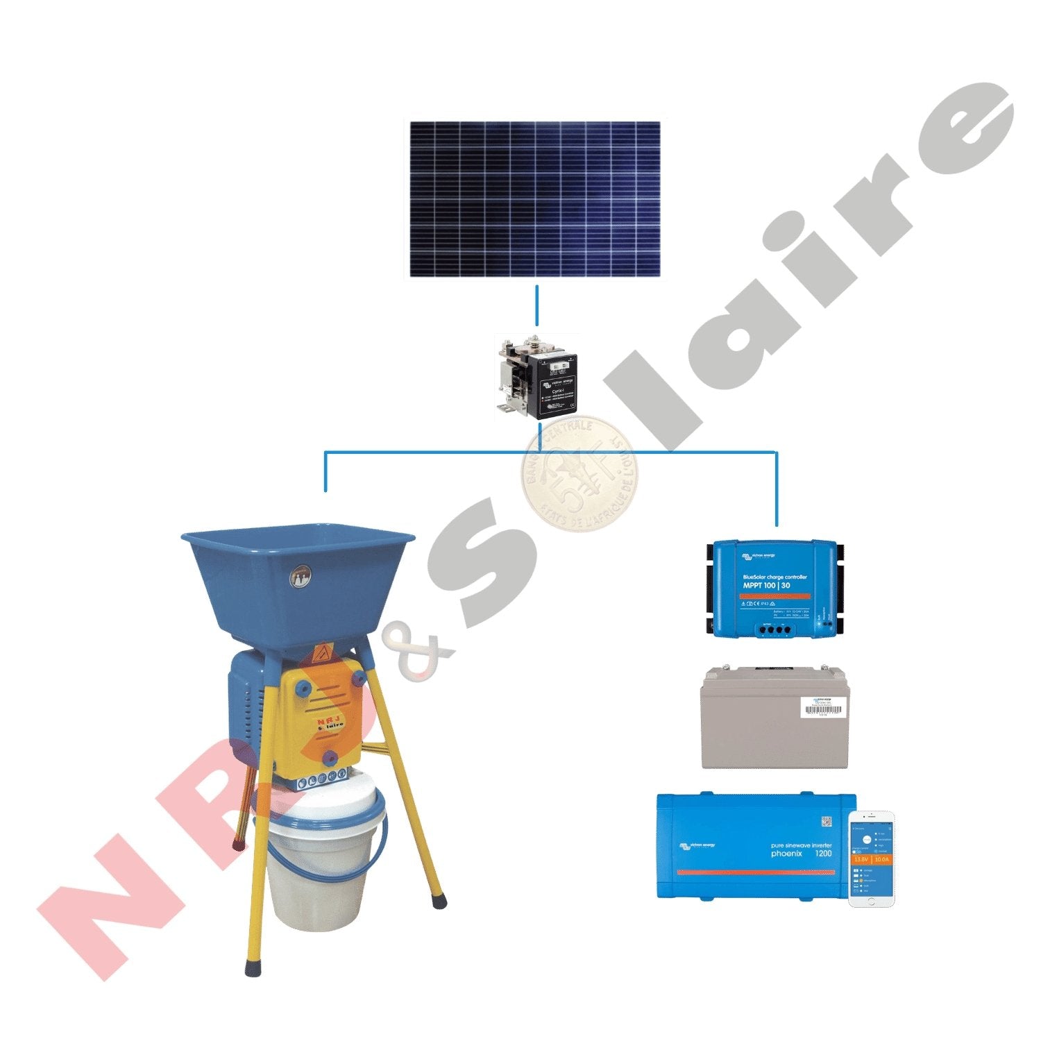 - Moulin solaire pour le broyage de céréales telles que mil, maïs, avoine, orge, seigle, etc.